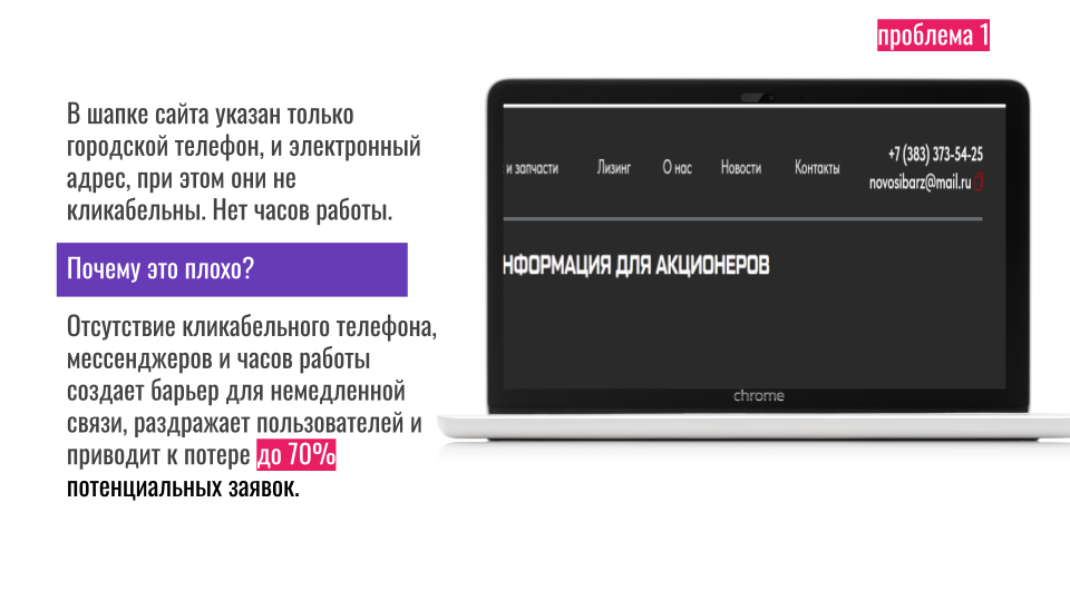 Телефон только городской, и он не кликабельный. В 2025 году люди хотят нажать на номер и сразу позвонить, а не переписывать.