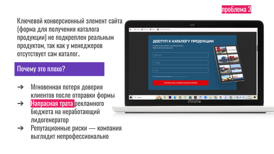 И самое смешное: на сайте была форма «Заполните и получите каталог». Некоторые посетители её заполняли. Но менеджеры даже не знали об этих заявках — уведомления не настроены. А каталога в PDF у них вообще не существовало.