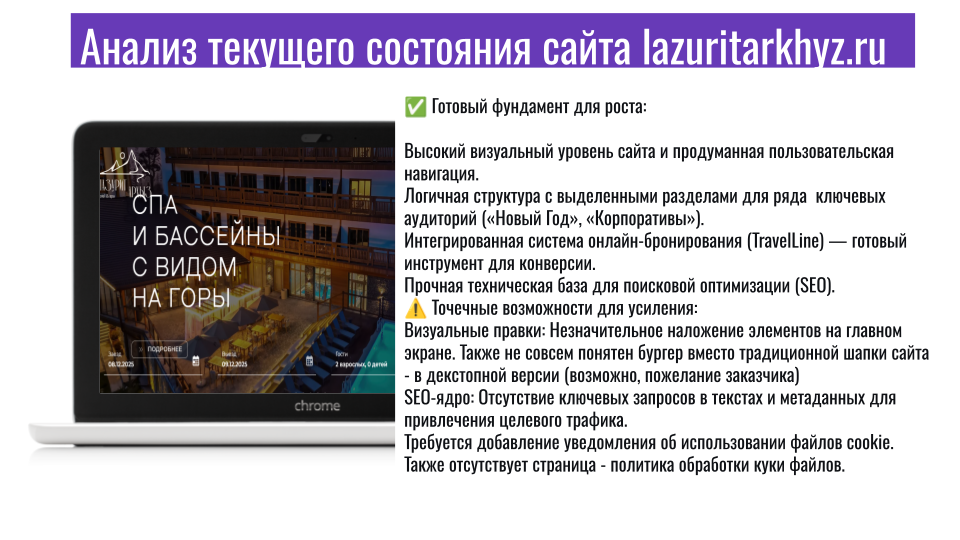 Я работала руководителем отдела продаж в парк-отеле. За это время через меня прошли сотни гостей — с разными запросами, ожиданиями, бюджетами. И я хорошо усвоила одну вещь: сайт — это место встречи. Если на встрече гость не получает ответов на свои вопросы, он уходит. И ищет другой отель, где ему всё объяснили заранее.