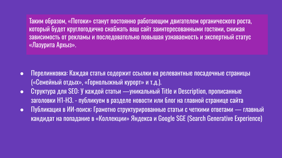 Горнолыжники. Они планируют поездку как мини-проект: изучают карты трасс, сравнивают цены на ски-пассы, ищут прокат качественного снаряжения. Если этой информации нет на сайте отеля, они идут в телеграм-каналы и местные чаты. И там, скорее всего, находят предложение остановиться в другом месте. Где им сразу дали ссылку на карту склонов и объяснили, как добираться до подъёмника.