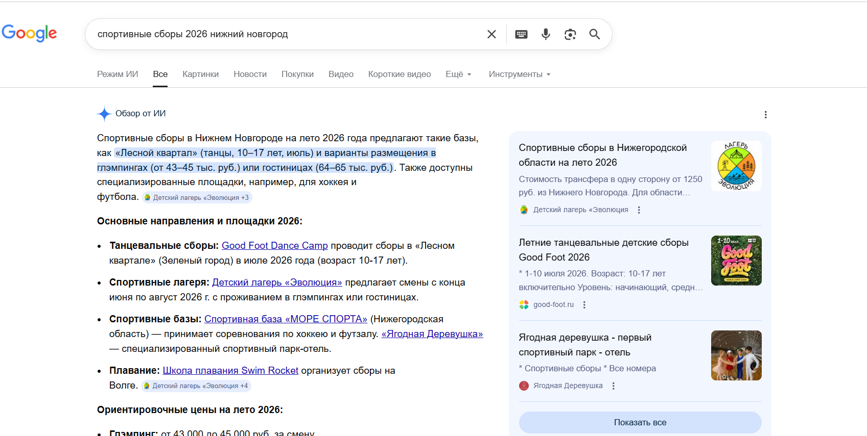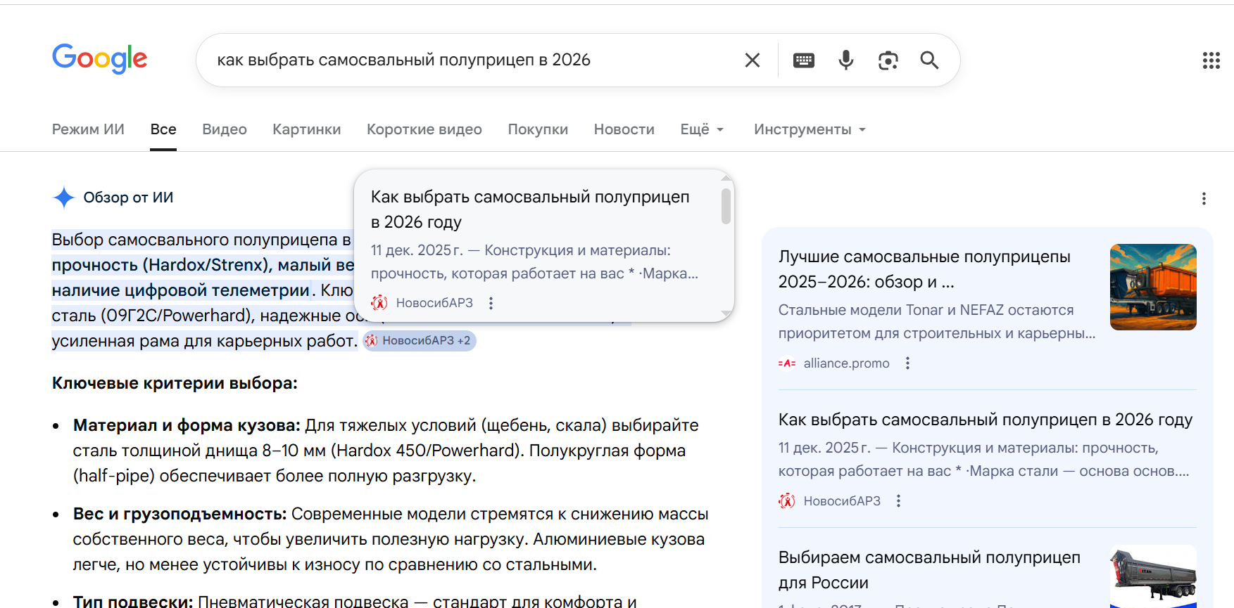 Вместо «отель Нижний Новгород» берем запрос «спортивные сборы в Нижнем Новгороде 2026». Частотность в Вордстате смешная, но когда тренерам и спортсменам нужно размещение, они ищут именно так. Для «НовосибАрз» сработал запрос «как выбрать самосвальный полуприцеп в 2026 году». Человек уже готовится к покупке, он не просто ищет «купить», а разбирается в теме. И мы дали ему этот разбор.